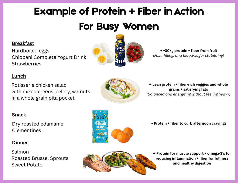 Think of plants as the anchor of your plate — fruits, vegetables, whole grains, beans, and legumes — then build around them with quality proteins and healthy fats. Most women benefit from 25–38 grams of fiber per day, spread across meals.